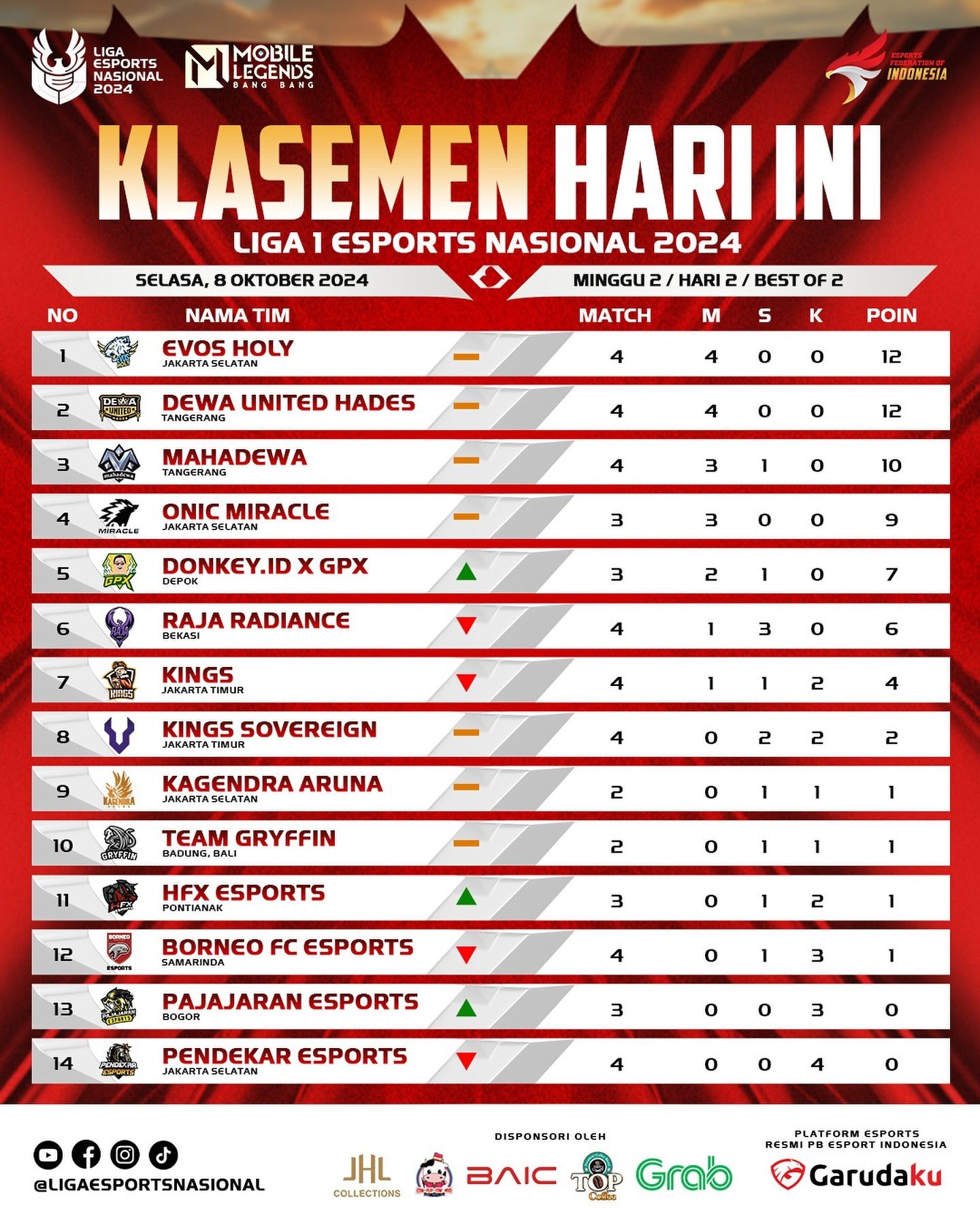 Dengan demikian, lagi-lagi EVOS Holy dan Dewa United Hades masih mendominasi di klasemen sementara Liga 1 Esports Nasional 2024 dengan kemenangan berturut-turut selama 4 hari bertanding. Namun, kali ini menjadi semakin sengit dengan adanya kehadiran dari Mahadewa dan ONIC Miracle yang sama-sama meraih kemenangan di match sebelumnya yang kini berada di posisi 3 dan 4. Raja Radiance yang sebelumnya berada di posisi kelima harus turun di posisi keenam karena Donkey ID GPX berhasil mendapatkan kemenangan di hari ini yang kini berada di posisi kelima. Kings yang mendapatkan penalti pada hari ini malah berada di posisi ke-7 dengan hasil 1 kali menang, 1 kali seri dan 2 kali kalah.
