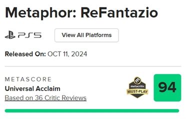 Pada 8 Oktober 2024, situs agregasi review yaitu Metacritic memberikan skor untuk game Metaphor: ReFantazio dengan skor tinggi yaitu sebesar 92 poin untuk versi Xbox, 94 poin untuk versi PlayStation®5 (nilai tertinggi di antara rilis tahun 2024), dan 91 poin untuk versi Windows/Steam (per tanggal 11 Oktober).