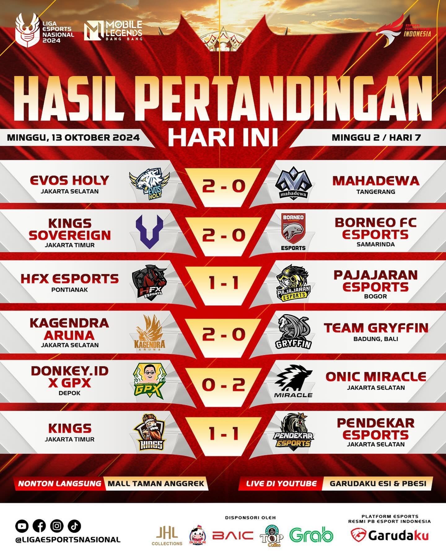 Liga Esports Nasional 2024 semakin memanas memasuki minggu kedua hari ketujuh dengan menghadirkan pertarungan sengit yang kembali tersaji dengan hasil-hasil penting yang mempengaruhi posisi klasemen sementara di hari ini.