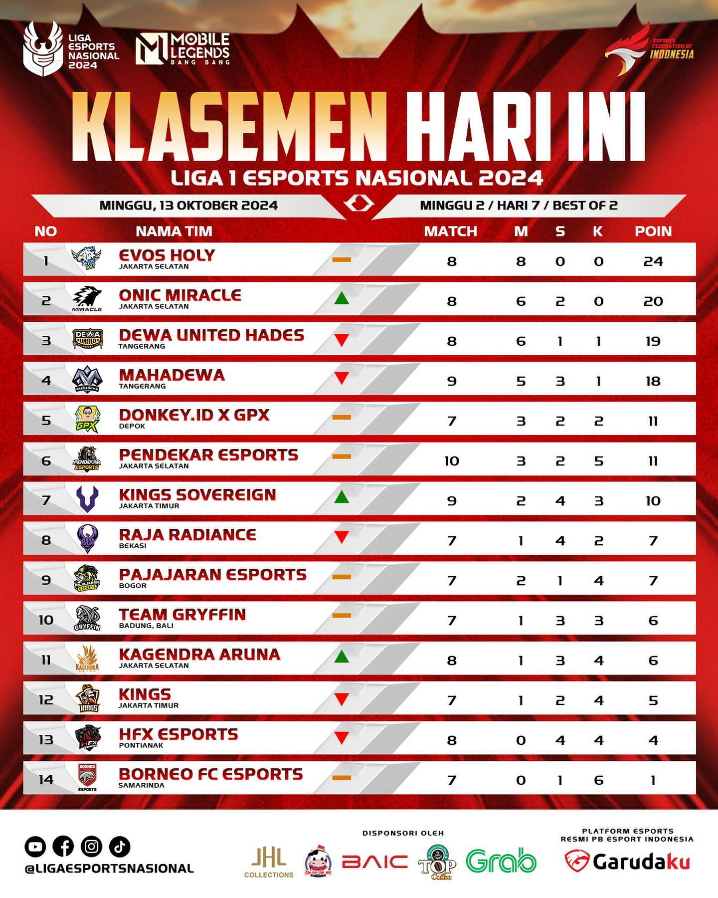 Hasil klasemen sementara di week kedua di hari ketujuh ini, EVOS Holy masih dingin berada di posisi puncak dengan membawa 8 kali kemenangan tanpa adanya hasil kalah maupun seri. Lewat kemenangannya di hari ini, ONIC Miracle berhasil menggeser posisi kedua milik Dewa United Hades sekaligus harus bersanding dengan sang adik, Mahadewa yang berada di posisi keempat.