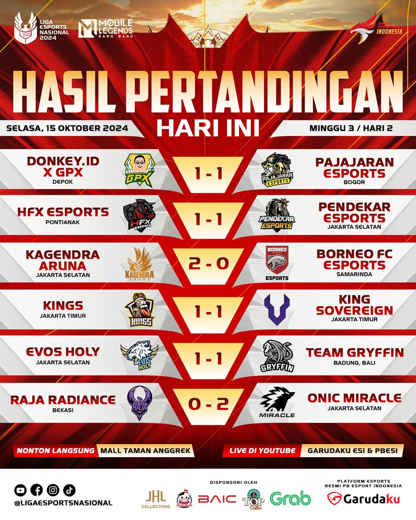 Match penutup hari ini ditutup dengan kemenangan dari ONIC Miracle yang berhasil menundukkan Raja Radiance lewat pemilihan skuad aslinya di hari ini, sehingga ONIC Miracle mendapatkan point kemenangan dengan skor 2-0. Di stage sebelahnya, Kagendra Aruna lagi-lagi berhasil melanjutkan tren positif kemenangan tiga kali berturut-turut pada minggu ini lewat pertandingan melawan sang penghuni dasar klasemen, Borneo FC Esports dengan skor 2-0. Walau di game kedua, tim Kagendra Aruna sempat kepleset karena Borneo FC Esports di early game sangatlah tangguh karena penggunaan kombinasi hero Chip dan Minsittar yang membuat mereka kewalahan dalam mengambil turtle hingga lord.