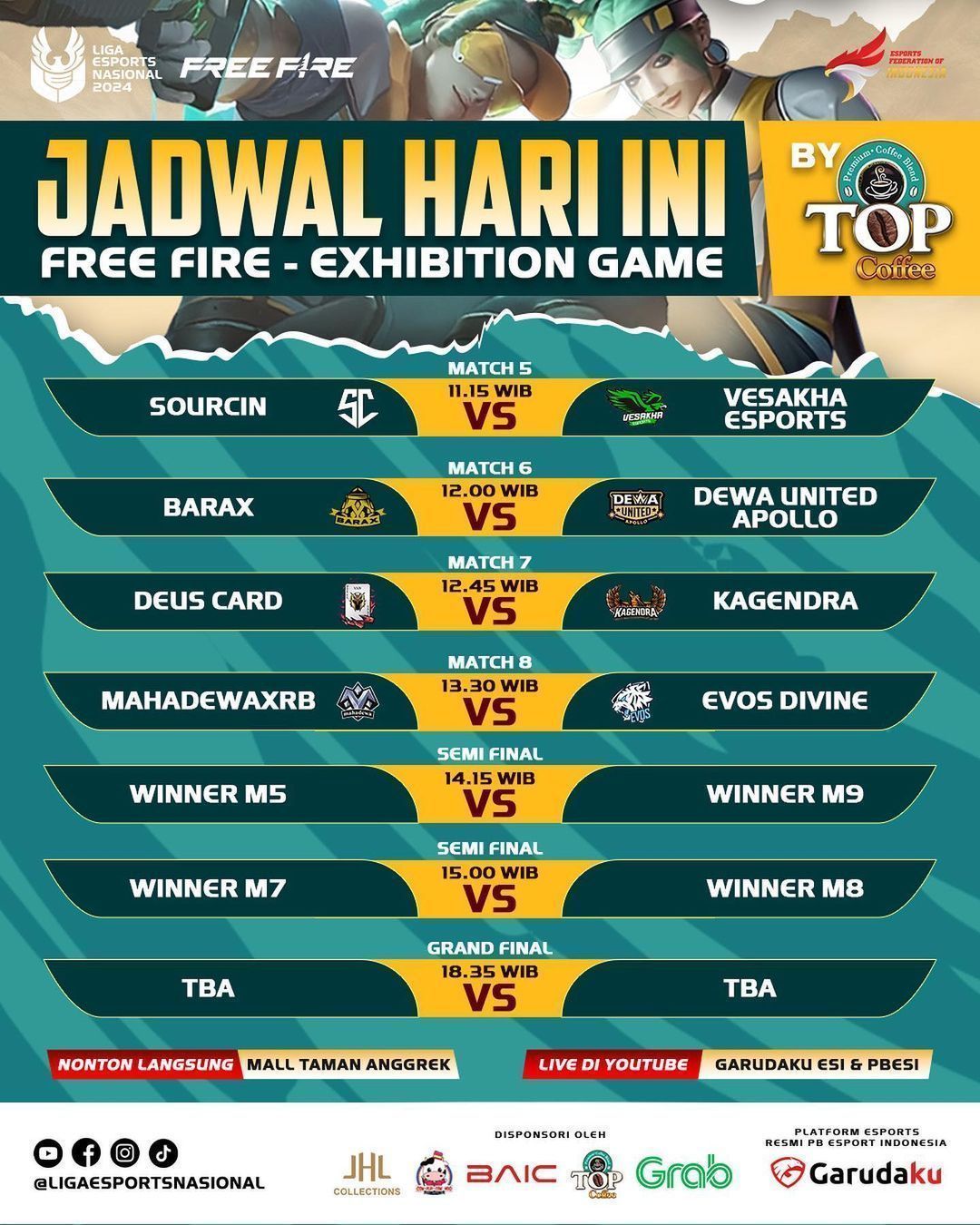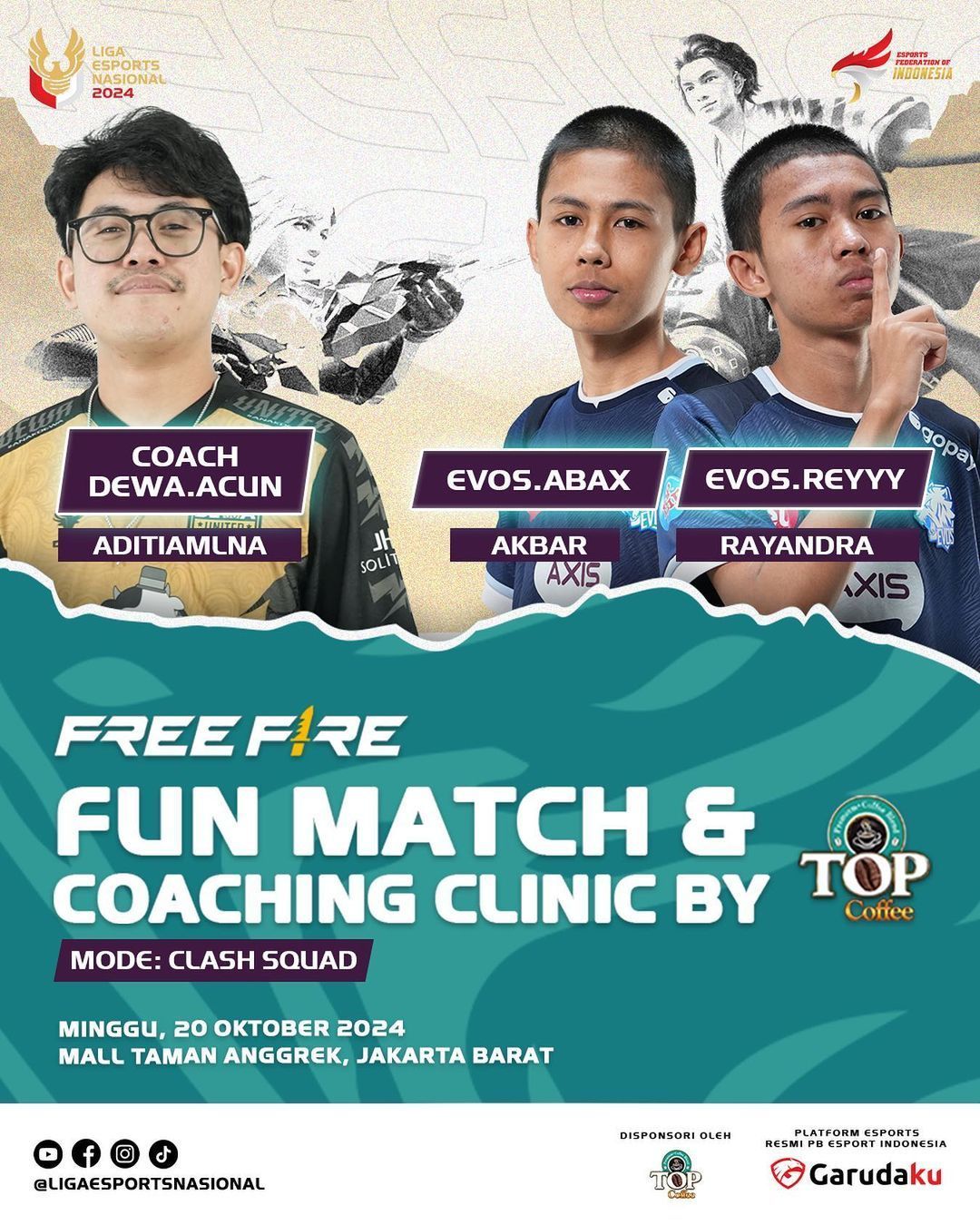 Exhibition games Free Fire dengan mode Clash Squad yang dipersembahkan oleh Top Coffee juga akan diikutioleh tim-tim e-sport profesional FF seperti EVOS Divine, Vesakha Esports, Dewa United Apollo, dan Kagendra. Di booth Top Coffee juga menghadirkan kegiatan seru seperti Coaching Clinic bersawa coach Dewa United Acun alias Fluxys.