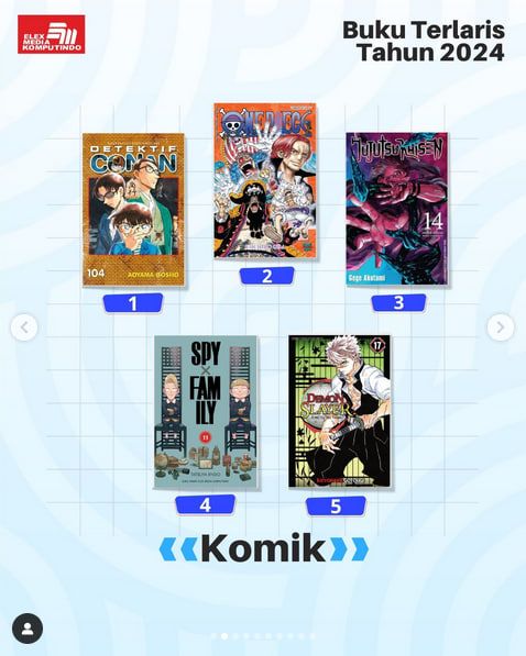 Melalui media sosialnya, penerbit Elex Media Komputindo memberikan informasi mengenai buku-buku terbitannya yang paling laris terjual selama tahun 2024. Di antaranya terdapat juga daftar komik-komik terlaris dan komik pendidikan terlaris selama tahun 2024. Inilah komik-komik terlaris Elex Media 2024: