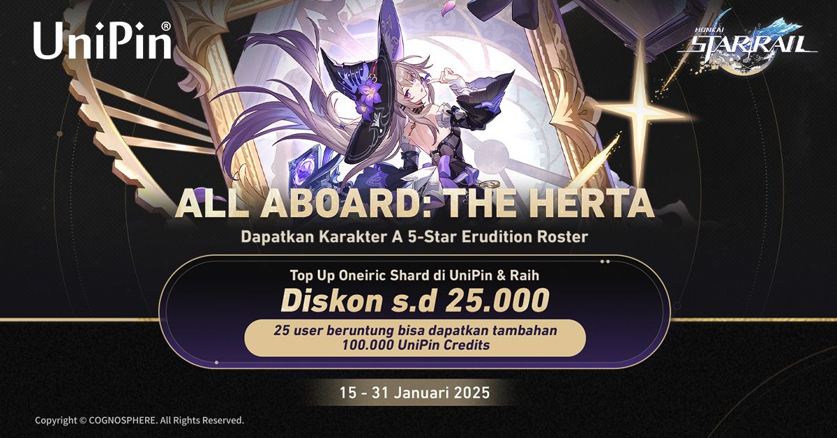 Untuk menyambut update ini, UniPin menghadirkan promo spesial untuk para pemain Honkai: Star Rail. Isi ulang Oneiric Shards melalui UniPin dan nikmati potongan harga hingga Rp25.000 serta kesempatan memenangkan total 2,5 juta UniPin Credits.
