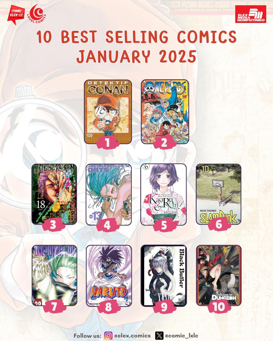 Melalui akun media sosialnya, penerbit Elex Media Komputindo telah memublikasikan judul-judul komik best seller terbitan mereka selama bulan Januari 2025. Inilah komik-komik Best Seller Elex Media Januari 2025: