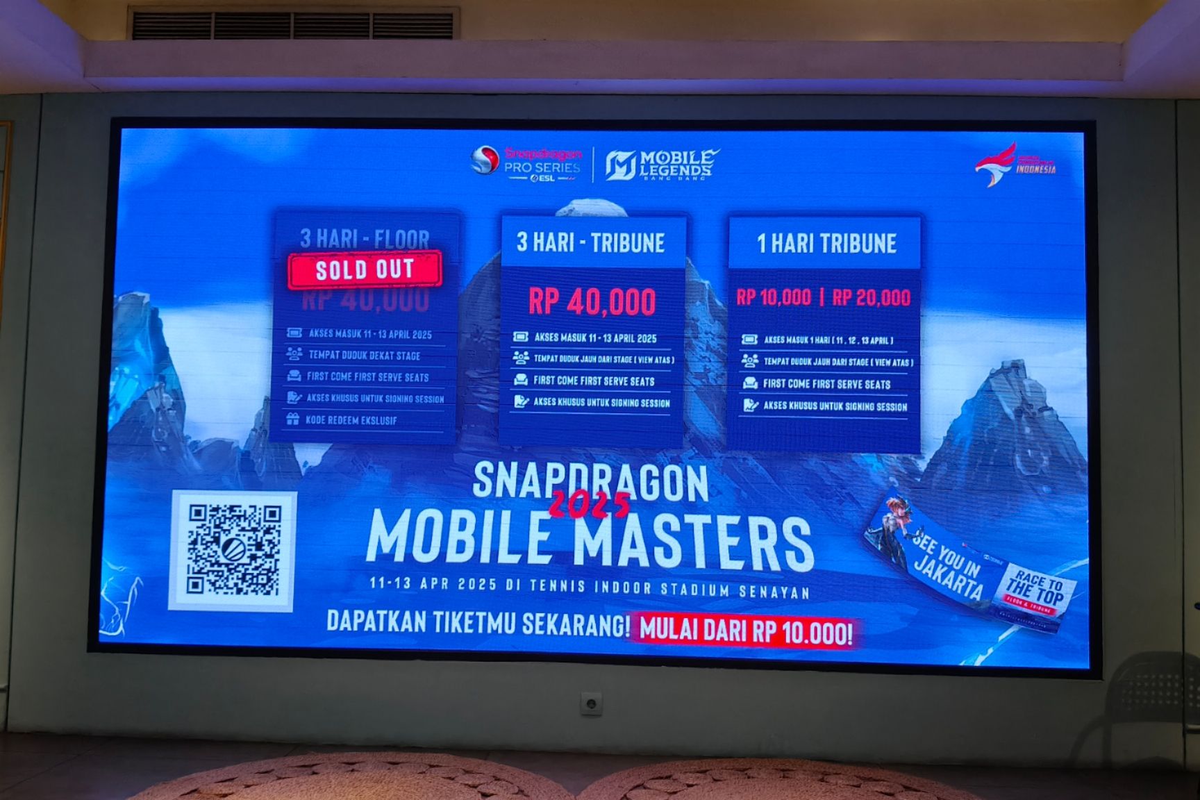 Turnamen ESL Snapdragon Pro Series Mobile Masters 2025 akan digelar di Tennis Indoor Senayan, Jakarta pada tanggal 11-13 April 2025 dengan harga tiket yang dimulai dari harga Rp 10.000 per hari, kalian bisa menikmati semua experience dari pertandingan Snapdragon Pro Series Mobile Masters 2025. Tiket bisa dibeli melalui situs esl.gg/spsmaster25tickets.