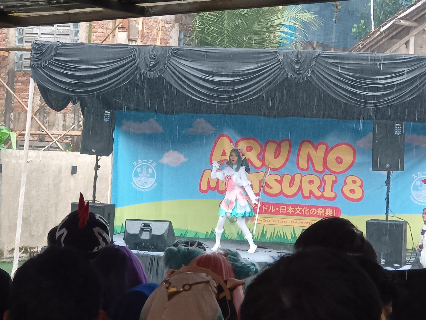Menjelang sore, hujan deras akhirnya turun mengguyur venue Aru no Matsuri Vol. 8. Meskipun begitu, para pengunjung, peserta lomba cosplay, dan guest star tetap semangat mengikuti acara ini hingga selesai!
