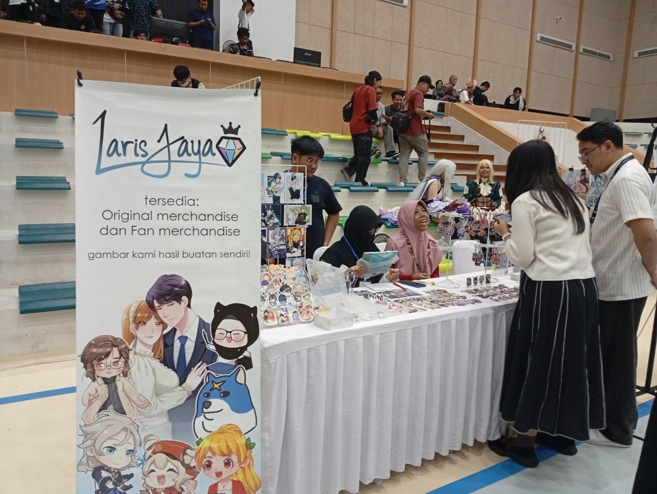 Di ketiga booth mereka itu, mereka banyak menampilkan berbagai karya gambar buatan mereka tersebut mulai dari sticker, pin, poster, gantungan kunci, dan bahkan fanbook artwork bernama HoyoColle (kumpulan artwork dari berbagai game buatan Hoyoverse) yang bisa ditemukan di booth ketiga (B3) dengan harga 50k. Bagi kalian yang ingin bergabung ke komunitas ini dan melihat berbagai aktivitas dari kelompok ini silahkan untuk mengfollow di akun IG mereka di @saturdraw.art.