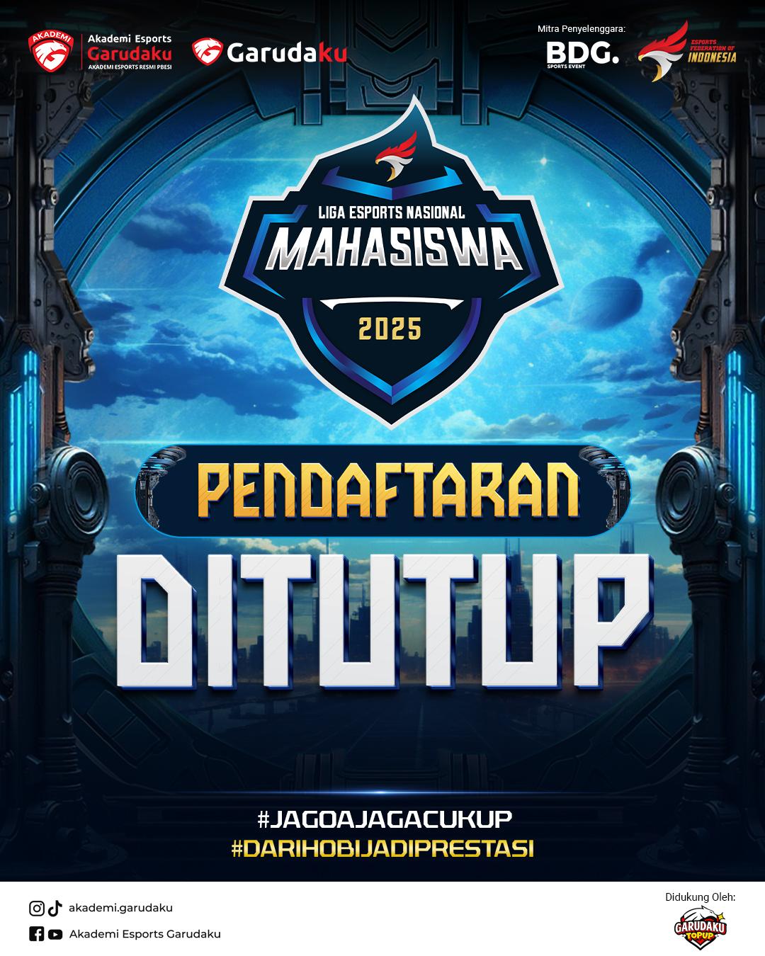 Seluruh pertandingan Grand Final dapat disaksikan secara langsung melalui YouTube Akademi Garudaku. Jangan lewatkan aksi-aksi luar biasa dan atmosfer persaingan yang memukau di puncak kompetisi mahasiswa terbesar tahun ini!