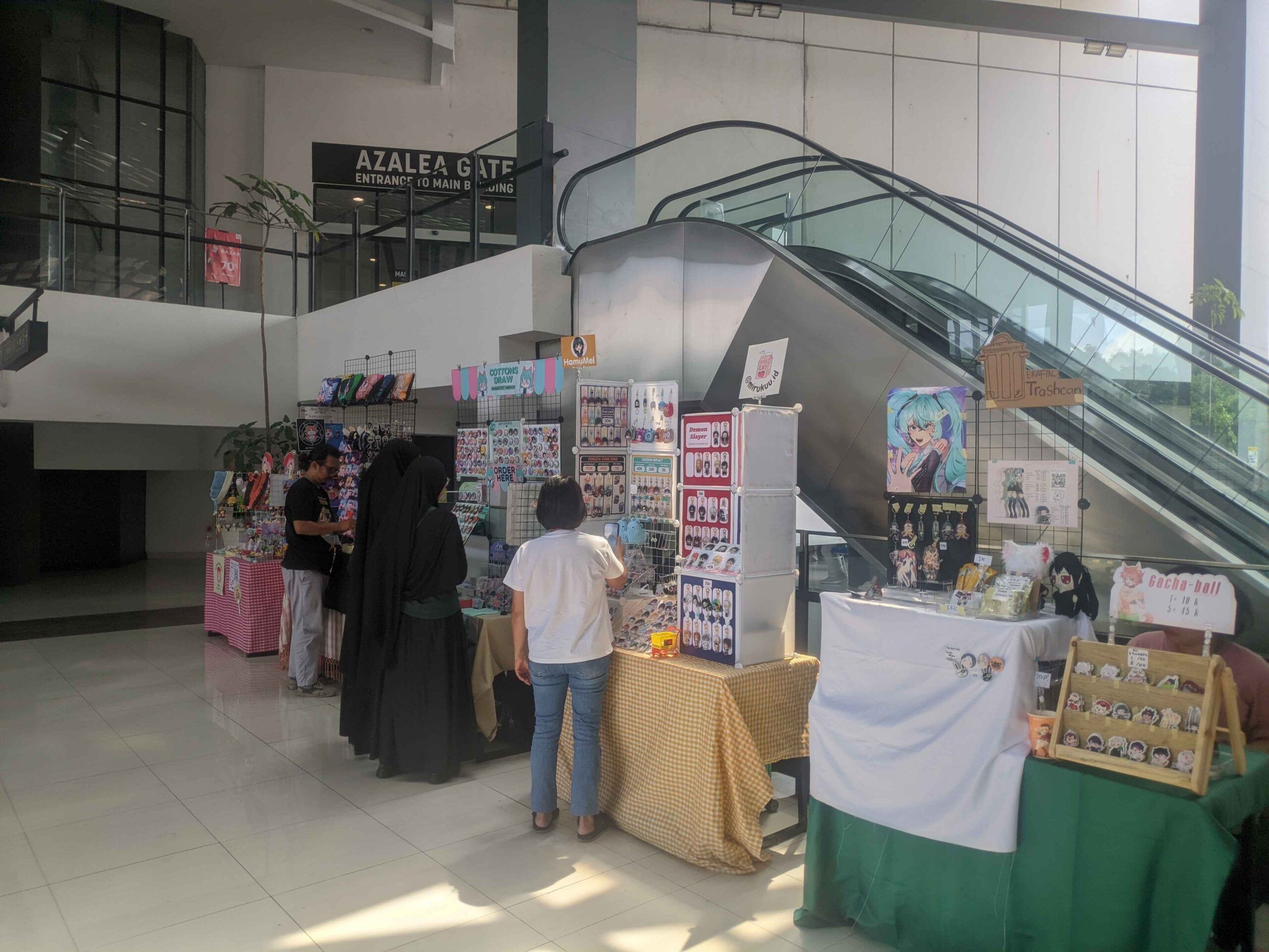 Selain itu, ada pula booth para kreator lokal yang menjual berbagai mechandise fan-made seperti stiker, poster, boneka, bantal mini, sampai gantungan kunci bertema anime, game, dan vtuber yang menjadi incaran para pengunjung. Tak lupa, area komunitas juga tersedia sebagai ruang terbuka untuk para member anggota komunitas jejepangan untuk saling karaoke-an dan kumpul bareng.