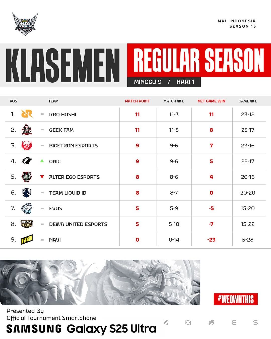 Selepas MPL ID Season 15 Week 9 Day 1, Geek Fam sudah dipastikan akan melangkah di upper bracket di babak playoff nanti. Sementara Bigetron Esports dan ONIC akan kejar-kejaran berebut posisi tiga besar dengan menyisakan satu kali pertandingan.