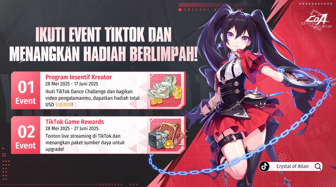 Crystal of Atlan resmi bekerja sama dengan TikTok untuk menggelar festival kreator global. Selama sesi tantangan video pada 28 Mei hingga 17 Juni 2025 nanti, hanya dengan mengunggah video pendek bertema game dengan tagar #CrystalofAtlan dan #CoA, para kreator berkesempatan untuk memenangkan total hadiah uang tunai sebesar USD $27.000 yang dibagikan di masing-masing negara seperti Thailand, Indonesia, Filipina, dan Brasil. Dengan dukungan trafik resmi dari TikTok, kalian bisa membuat konten viral dengan mudah! Selain itu, dalam event live streaming yang diadakan pada 28 Mei hingga 27 Juni 2025, para kreator bisa menautkan paket item dalam live streaming untuk meningkatkan popularitas. Para penonton yang menyelesaikan misi juga bisa mendapatkan berbagai hadiah menarik. Kalian juga bisa ikut serta hanya dengan minimal 100 followers! Baik dalam membuat video pendek maupun live streaming, jangan lewatkan kesempatan untuk bergabung di panggung penuh semangat Crystal of Atlan. Tunjukkan kreativitasmu, raih kebanggaan dan hadiah menarik siap menantimu!