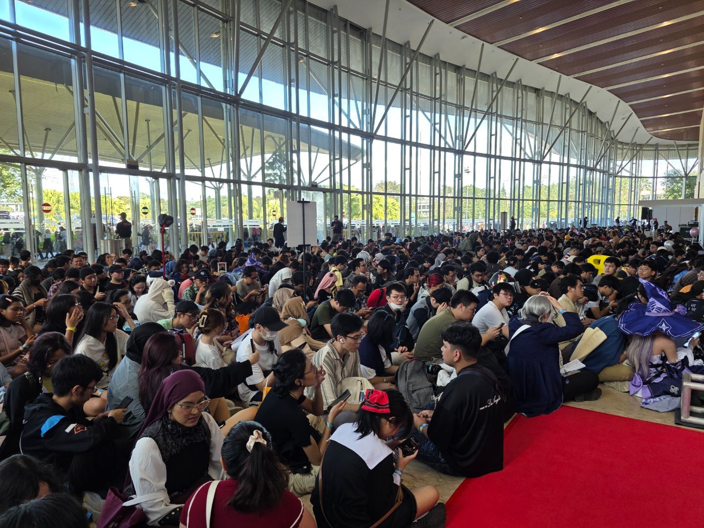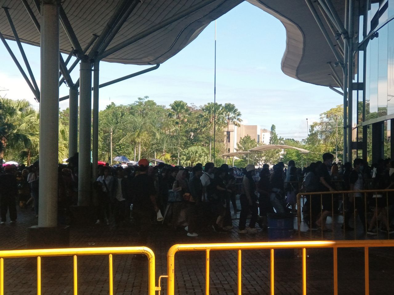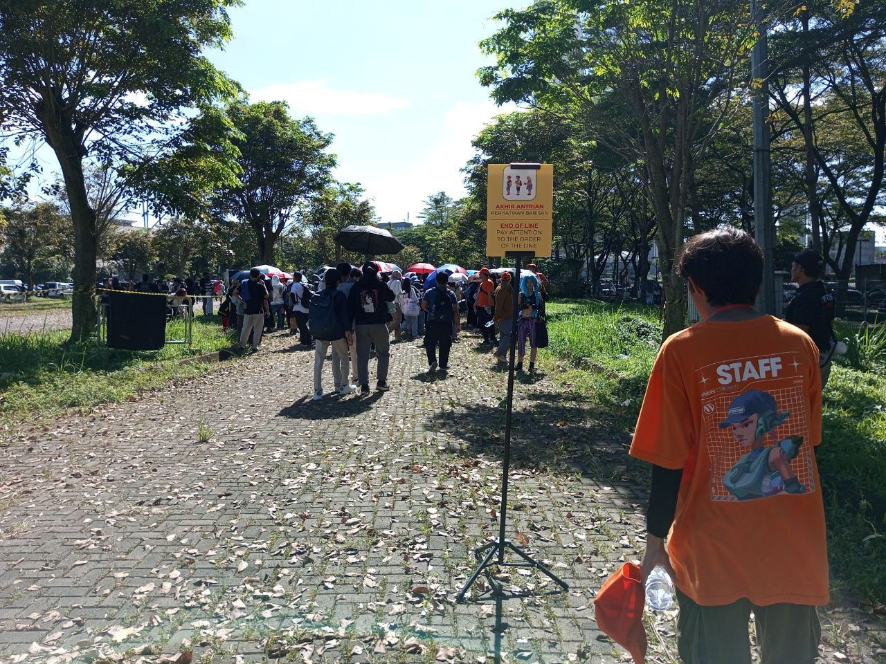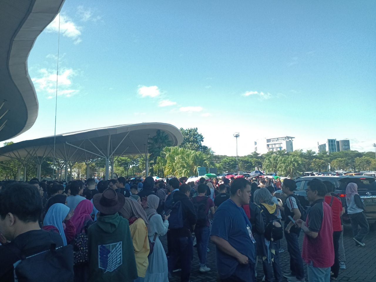 Para pengunjung yang telah menukar tiket kemudian mengantri di depan area Hall 10 ICE BSD. Berbeda dengan sebelumnya, area pre-function alias selasar di depan Hall 10 kini juga dipakai sebagai area tunggu antrian masuk Comifuro XX. Sehingga para pengunjung yang sudah mengantri sejak subuh kini bisa menunggu open gate tanpa perlu ber-panas-panasan di luar ICE BSD.