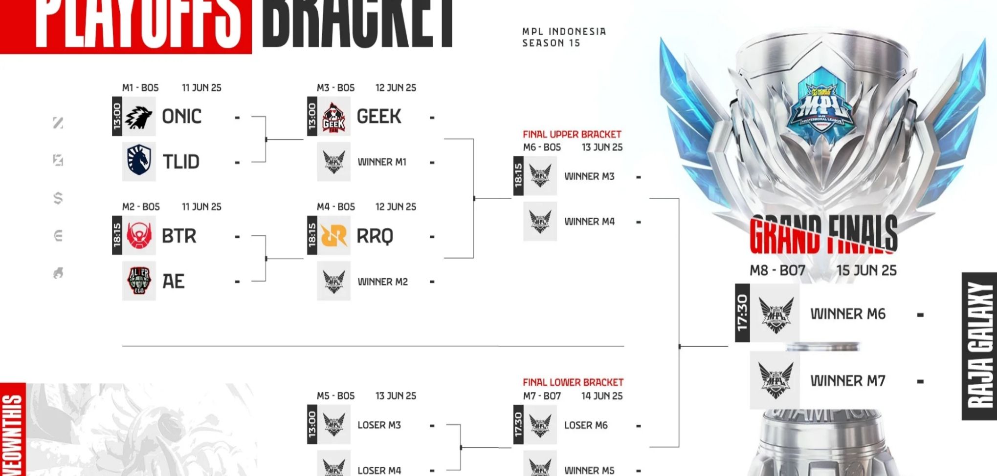 Babak Playoffs MPL ID akan kembali hadir di Jakarta International Velodrome untuk Season 15 ini pada tanggal 11 – 15 Juni 2025 nanti, di mana 6 tim akan memperebutkan piala Immortal Cup dan juga tiket menuju MSC at EWC 2025. Tiket Playoffs MPL ID S15 pun sudah dibuka dan bisa langsung didapatkan secara online. Kabar buruknya ada beberapa tiket untuk beberapa match per harinya di setiap kategori seperti Legend maupun Mythic sudah hampir ludes terjual.