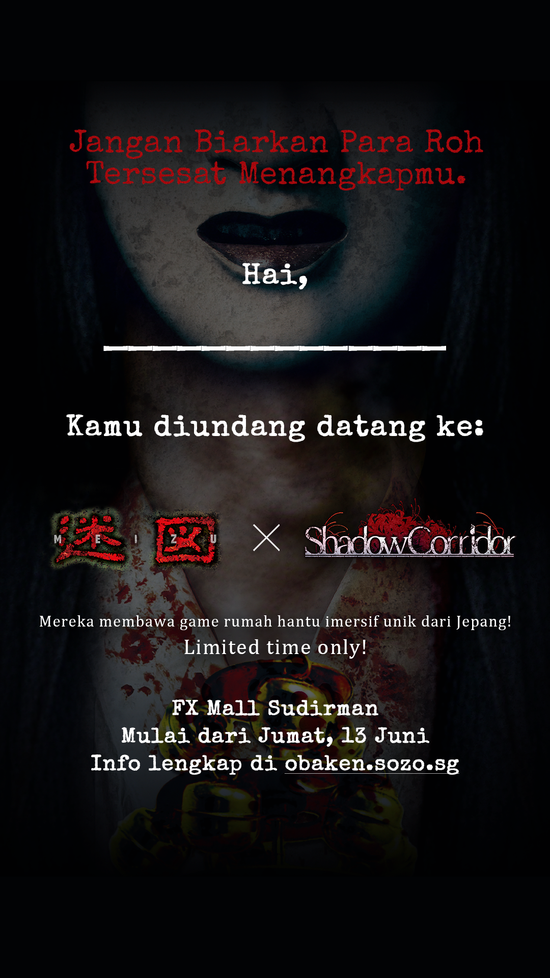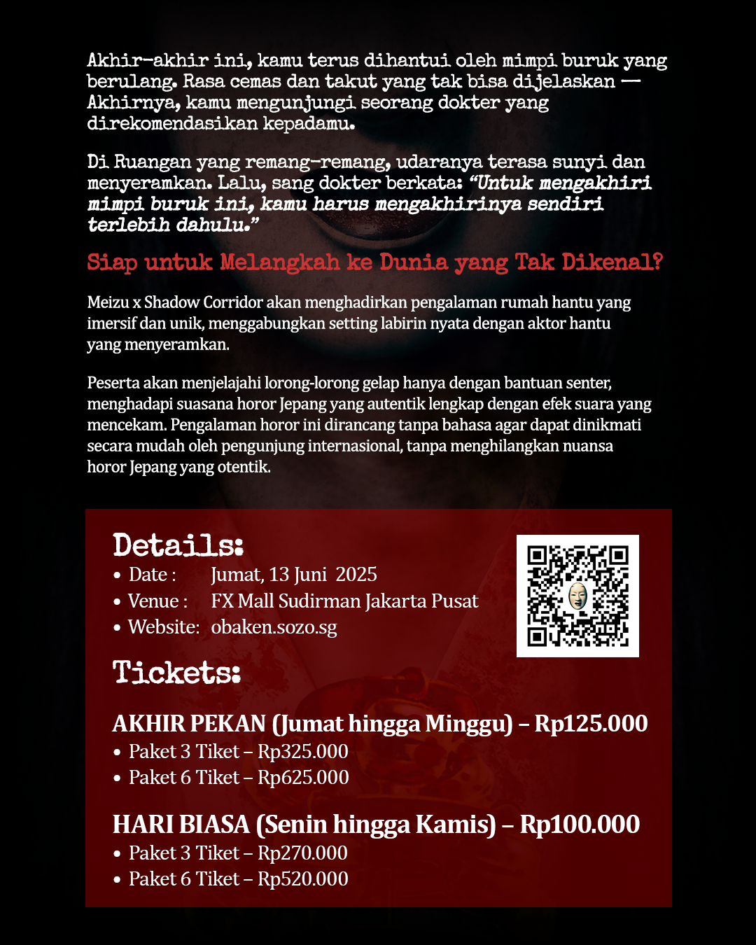 Penyelenggara acara SOZO kembali mengguncang Jakarta dengan meluncurkan sebuah atraksi horor yang benar-benar baru. Pada Jumat (13/6), wahana horor imersif MEIZU X SHADOW CORRIDOR resmi diubuka di FX Mall Sudirman. Atraksi ini mengajak para pemberani untuk merasakan langsung ketegangan rumah hantu ala Jepang yang dipadukan dengan labirin escape room.