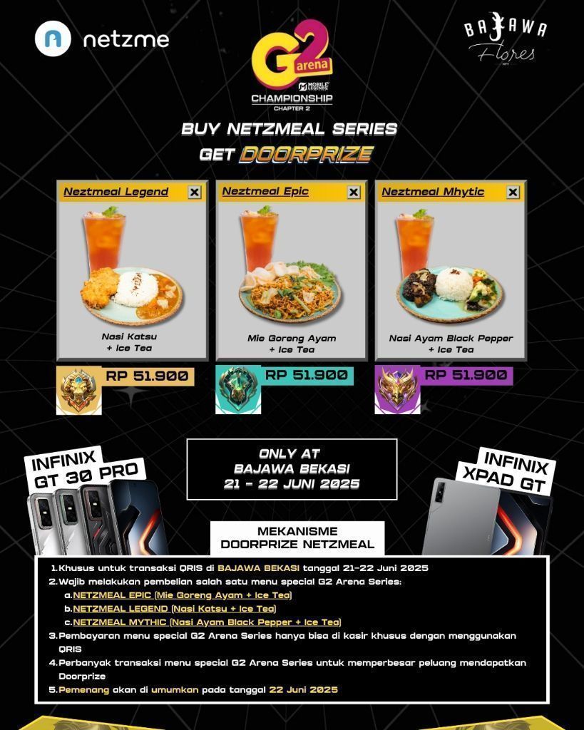 Sebagai bentuk apresiasi kepada penonton dan pengunjung, Netzme—sebagai main sponsor G2 Arena Chapter 2—menghadirkan promo Netzmeal Series, sajian spesial yang hanya tersedia pada tanggal 21–22 Juni 2025. Setiap pembelian menu Netzmeal (dengan QRIS Netzme di venue), akan otomatis tercatat dan berkesempatan mendapatkan doorprize menarik berupa Infinix GT 30 Pro serta grand prize berupa tablet INFINIX Xpad GT.