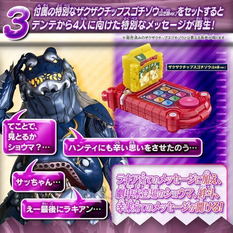 DX Gavvphone Rakia & Dente Edition juga hadir dengan Gochizo spesial, Zakuzaku Chips (crying face ver.). Gochizo ini memungkinkan kalian mendengar pesan berkesan Dente untuk Rakia dari serial Kamen Rider Gavv, lengkap dengan pesan-pesan Dente untuk Shoma, Sachika, dan Hanto. Sentuhan ini menambah nilai emosional pada mainan ini.
