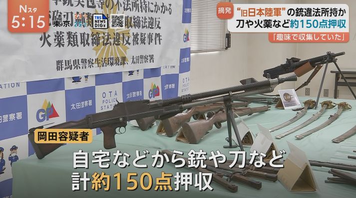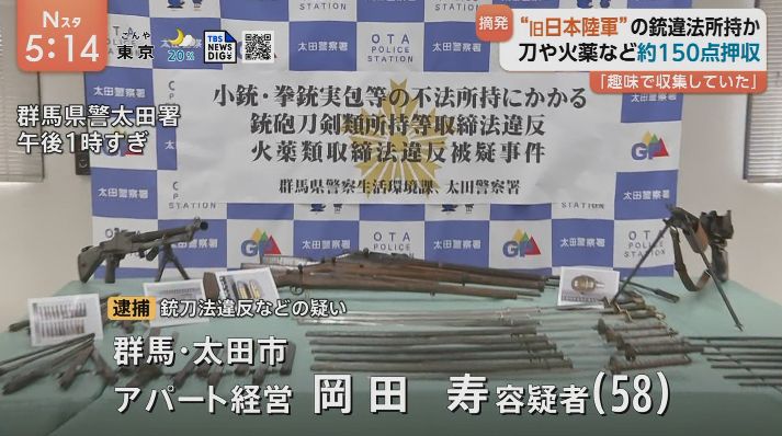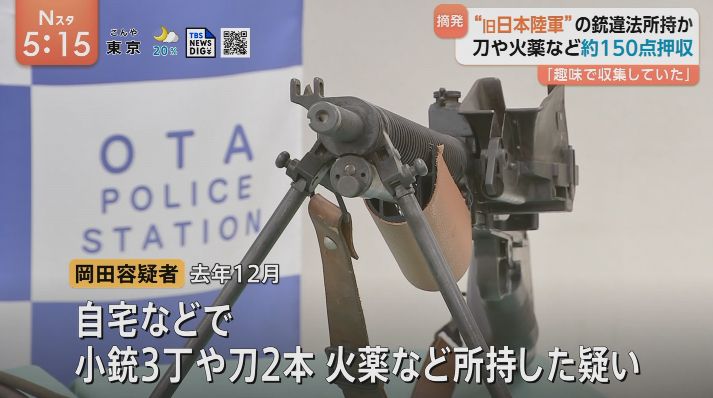 Seorang pria berusia 58 tahun asal Kota Ota, Prefektur Gunma, Jepang, harus berurusan dengan hukum setelah polisi menemukan ratusan item berbahaya di kediamannya. Ia diketahui menyimpan sekitar 150 benda, termasuk senjata api, pedang, bayonet, dan bahan peledak, yang sebagian besar merupakan peninggalan era militer Jepang.