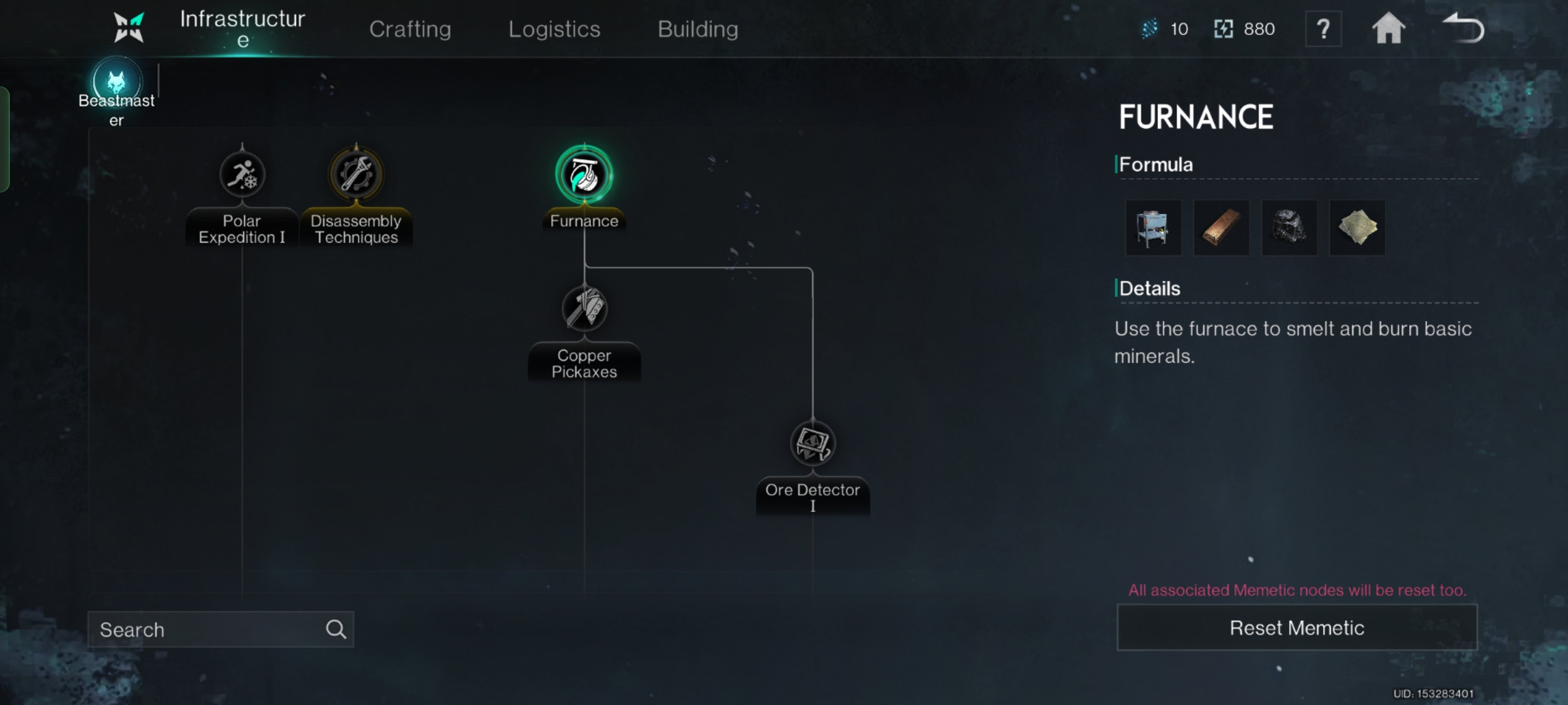 • Infrastructure: Berfungsi untuk menciptakan peralatan yang akan digunakan untuk mendapatkan sumber daya yang dibutuhkan. Contohnya, furnace yang berfungsi untuk merubah sumber daya seperti kayu menjadi charcoal hingga bijih logam menjadi logam untuk membuat peralatan.