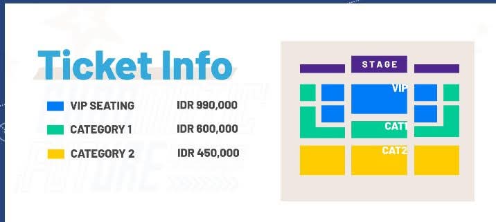 Untuk tiket konser ini bisa dibeli lewat platform ticket2u.id. Harga tiketnya terbagi menjadi tiga kategori, dimulai dari Category 2 dengan harga Rp 450.000 hingga kategori paling mahal sebesar Rp 990.000 untuk kategori VIP Seating. Penjualan tiket akan dibuka pada tanggal 27 Agustus 2025.