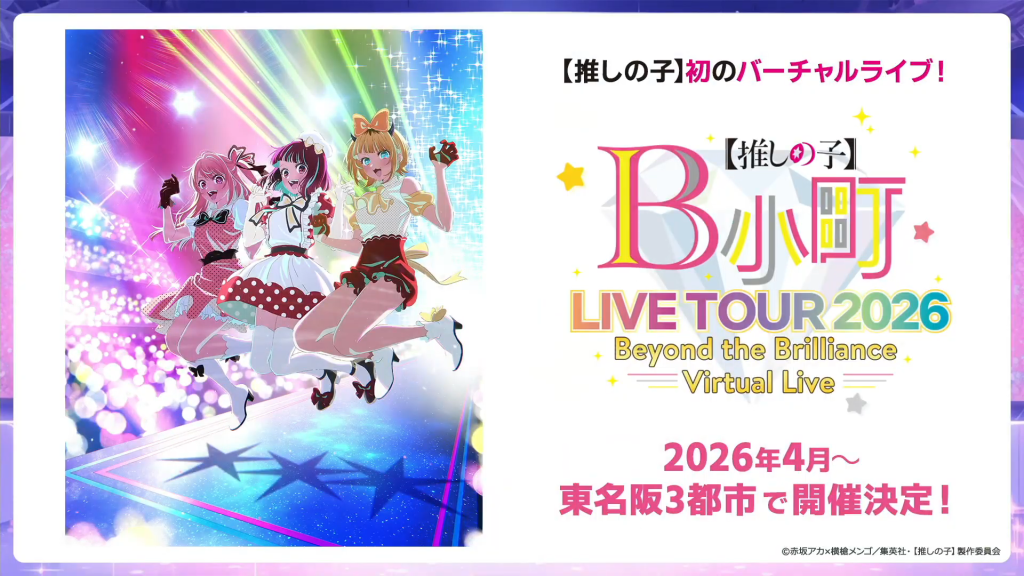 Para penggemar OSHI NO KO, bersiaplah! Grup Idol B-Komachi akan tampil secara langsung di atas panggung virtual pada tahun depan. Telah diumumkan bahwa sebuah tur konser virtual B-Komachi akan digelar di tiga kota besar Jepang: Tokyo, Nagoya, dan Osaka. Tur konser yang diberi judul OSHI NO KO B-Komachi Live Tour 2026 Beyond the Brilliance Virtual Live ini akan dimulai pada bulan April 2026.