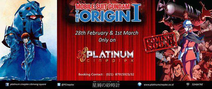 Jaringan bioskop Platinum Cineplex telah merilis jadwal pemutaran dari serial terbaru dari Gundam besutan studio Sunrise bertajuk Gundam The Origin. Gundam the Origin akan diputar pada 28 Februari dan 1 Maret 2015 bertempat di gerai-gerai Platinum Cineplex yang terletak di Solo, Magelang ,Cibinong, dan Sidoarjo. Berikut adalah jadwal pemutaran film ini di Platinum Cineplex: