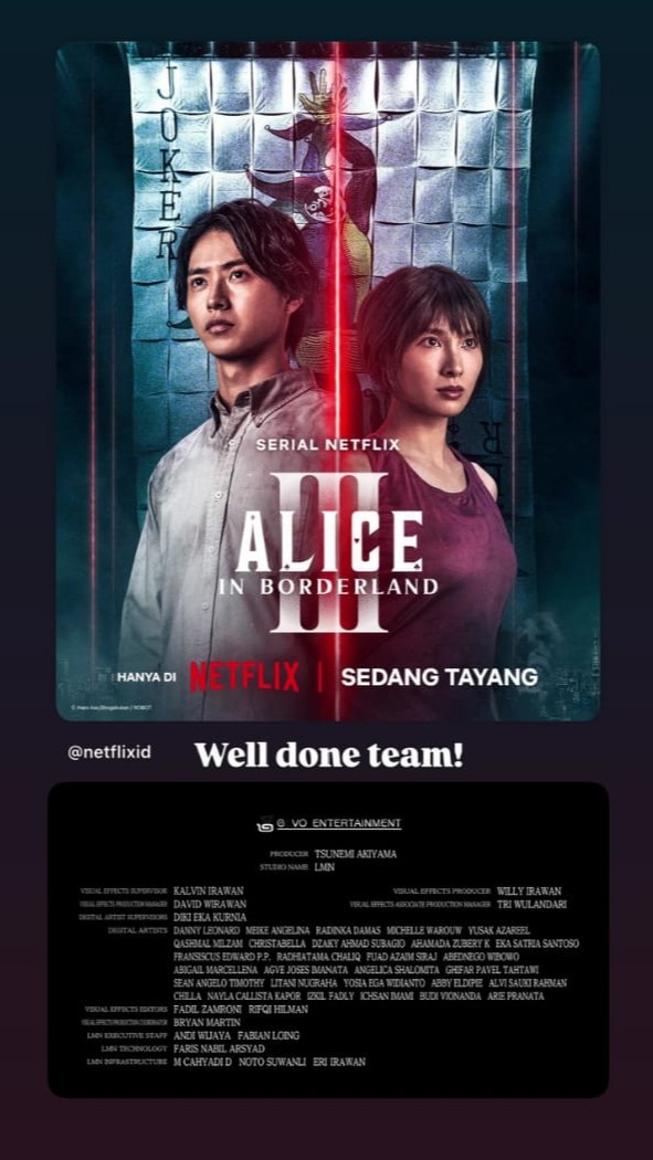 “Kami sangat bangga bisa menjadi bagian dari proyek sebesar ini”, ujar David Wirawan, VFX Production Manager di LMN VFX. “Alice in Borderland merupakan serial dengan basis penggemar global yang sangat kuat, sehingga dapat berkontribusi di dalamnya menjadi pengalaman yang berharga bagi tim kami.”
