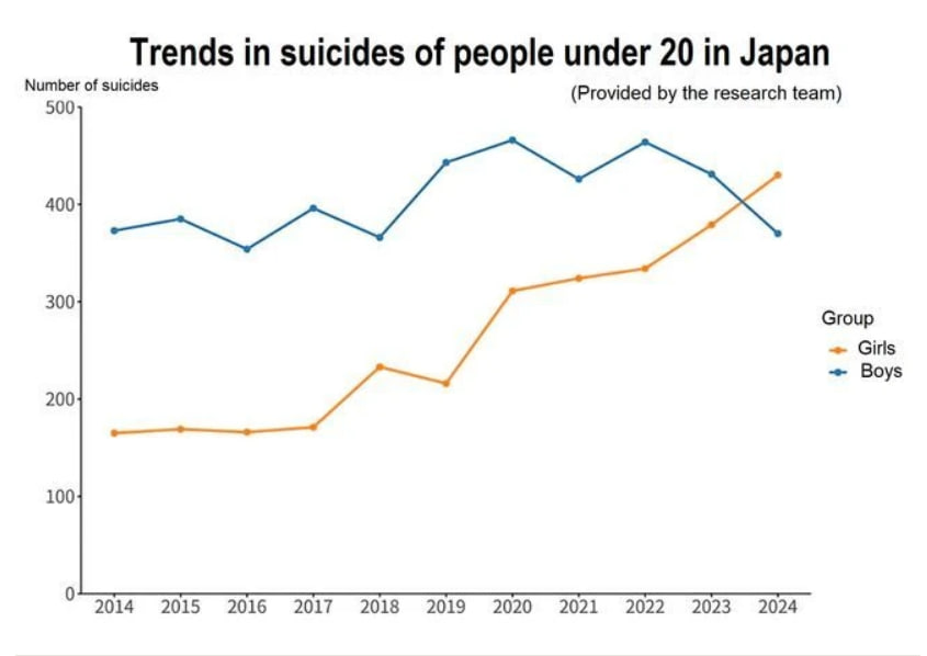 Laporan terbaru menunjukkan sisi muram dari kehidupan di Jepang, khususnya bagi remaja putri. Untuk pertama kalinya dalam sejarah pencatatan, jumlah perempuan di bawah 20 tahun yang bunuh diri melampaui laki-laki. Pada 2024, tercatat 430 remaja putri mengakhiri hidupnya, sementara remaja putra berjumlah 370 kasus. Fakta ini menegaskan betapa seriusnya masalah kesehatan mental yang tengah dialami generasi muda.