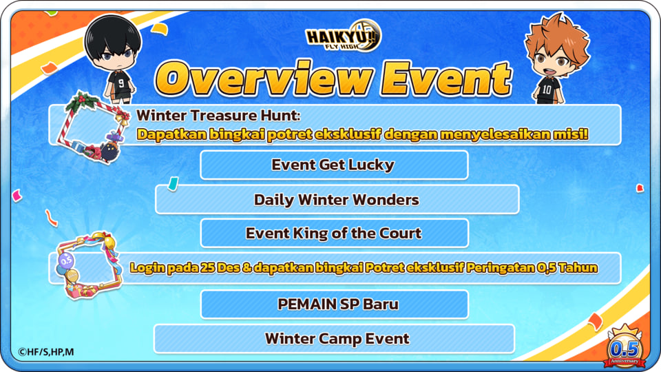Update 0.5 Anniversary dari game HAIKYU!! FLY HIGH resmi diluncurkan, menghadirkan duo “Freak Quick” yang sangat dinantikan oleh penggemar yakni Tobio Kageyama dan Shoyo Hinata ke dalam game. Dalam perayaan setengah tahun game HAIKYU!! FLY HIGH, Garena juga telah menyiapkan serangkaian event spesial, bonus login yang melimpah, dan berbagai kejutan meriah bagi seluruh penggemar. Dengan login selama periode event pemain bisa mendapatkan berbagai Tiket Rekrut, termasuk tingkat Supreme dan Ultra, serta membuka satu Bingkai Potret eksklusif. Jangan lewatkan peluang untuk bergabung dalam Winter Celebration!