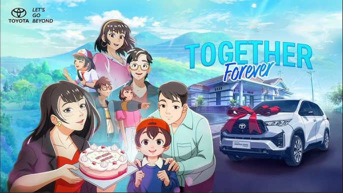 Kali ini giliran Toyota Indonesia yang merilis iklan bergaya anime. Dengan mengusung tajuk Together Forever, iklan ini hadir dengan tema cerita sebuah keluarga yang mengarungi pahit manisnya kehidupan berkeluarga mereka dari masa ke masa, dengan ditemani mobil-mobil Toyota, dan diiringi dengan alunan lagu Kau membuatku merasa hebat. Sebelumnya, sebuah video teaser berdurasi 15 detik telah dipublikasikan di akun Youtube resmi Toyota Indonesia. Kini, mari saksikan video iklan versi penuhnya yang berdurasi 3 menit ini:
