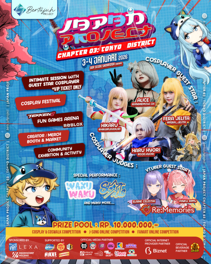 Bertujuh Project kembali menghadirkan gelaran event pop culture Japan Project di Kalimantan. Menjadi salah satu event jejepangan yang membuka tahun 2026, event Japan Project Chapter 03: Tokyo District kali ini akan digelar pada 3–4 Januari 2026 di GOR Segiri Indoor, Samarinda. Event ini akan menjadi tempat yang mempertemukan para fans jejepangan di Samarinda dan sekitarnya dari berbagai bidang, mulai dari anime, game, cosplay, musik Jepang, VTuber, hingga aktivitas komunitas kreatif.