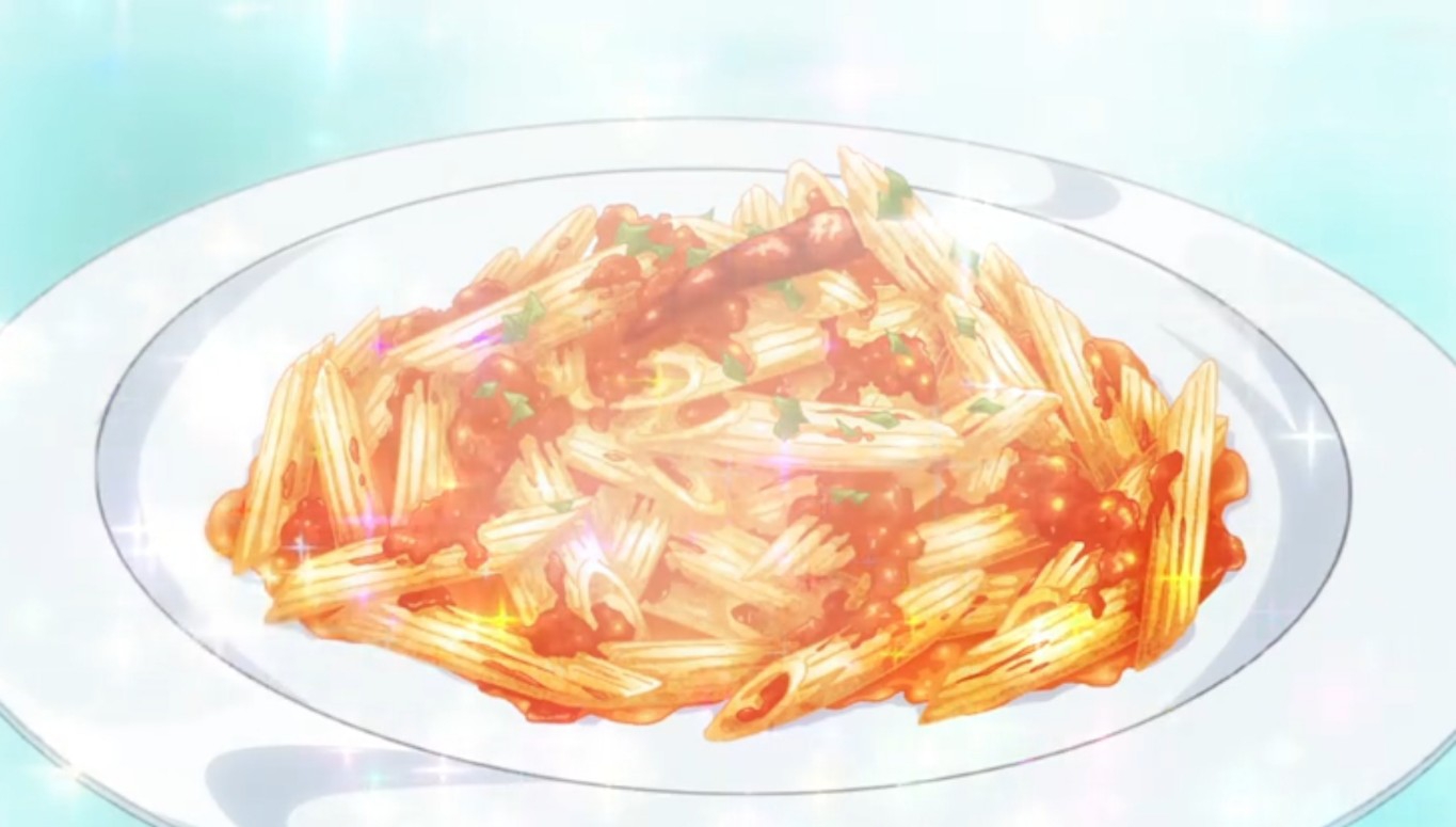 Salah satu menu pasta yang cukup menonjol dalam anime ini adalah penne arrabbiata. Hidangan pasta berbahan dasar saus tomat pedas ini dikenal sederhana, namun kuat dari segi rasa. Kehadirannya di Piace mencerminkan karakter masakan Italia yang mengandalkan keseimbangan bahan tanpa perlu teknik rumit.