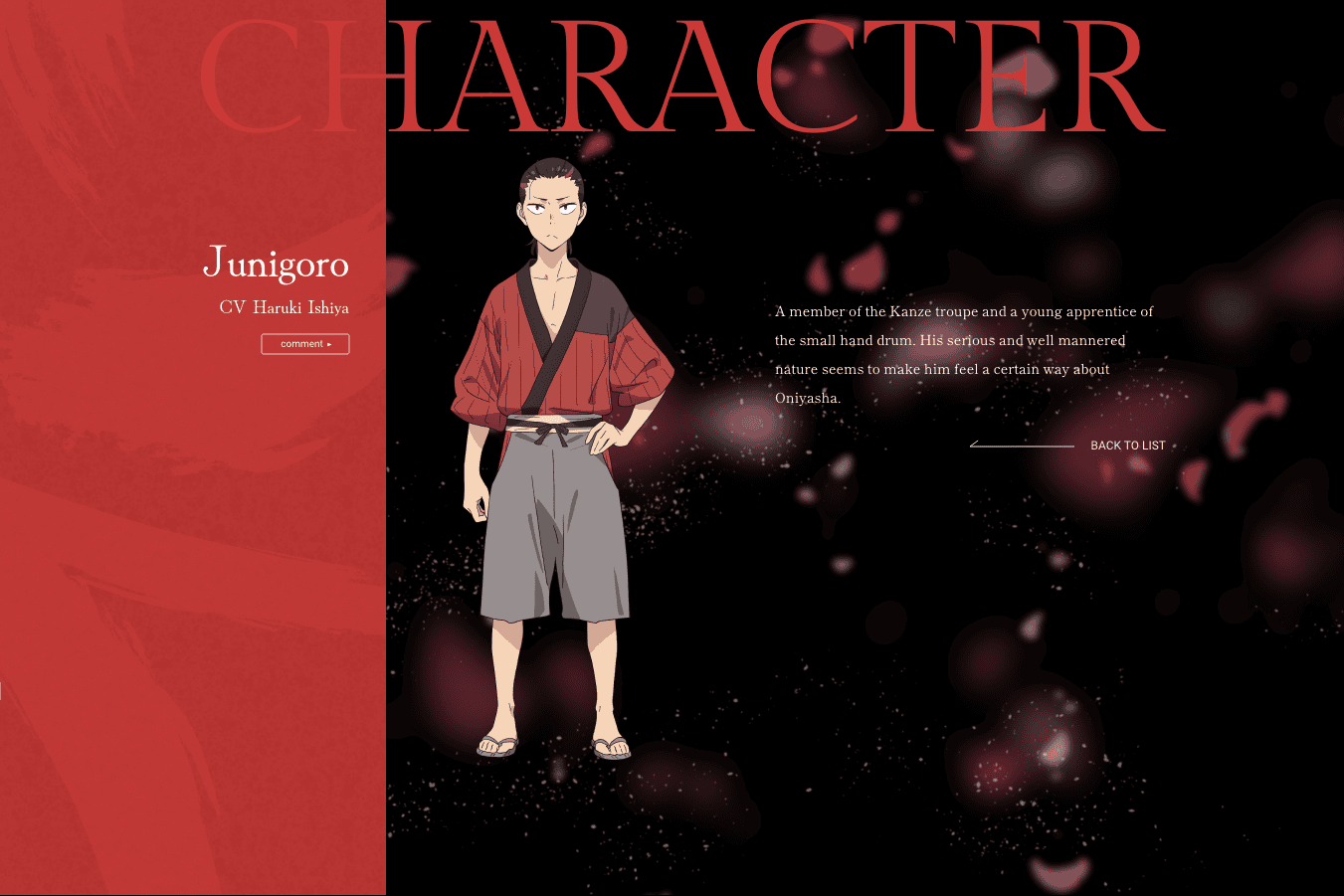 Panggung serial ini juga semakin kuat dengan kehadiran pengisi suara veteran Romi Park sebagai Zojiro, seorang penampil muda yang memimpin kelompok Dengaku Shinza dengan sangat tegas. Terakhir, Haruki Ishiya akan menyuarakan karakter Junigoro, seorang pemuda magang penabuh kendang kecil yang memiliki sifat serius dan sopan santun yang tinggi. Deretan pengisi suara yang sangat solid ini dipastikan akan membawa kedalaman emosi yang luar biasa ke dalam setiap dialognya.