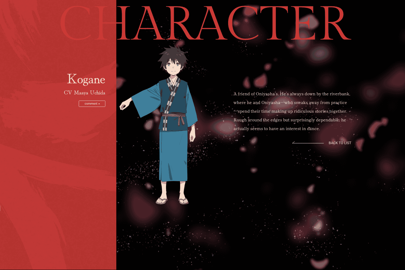 Selain itu, terdapat Shimba Tsuchiya yang berperan sebagai Ishiya, seorang anggota rombongan Kanze yang sangat memahami Oniyasha. Meskipun Ishiya harus menyerah untuk tampil di panggung karena kondisi kakinya sejak kecil, ia sangat ahli dalam melantunkan nyanyian dan memiliki hati yang baik. Maaya Uchida, pengisi suara yang populer lewat Chainsaw Man, turut hadir sebagai Kogane, sahabat Oniyasha di tepi sungai yang suka mengarang cerita konyol dan diam diam memiliki ketertarikan pada tarian.