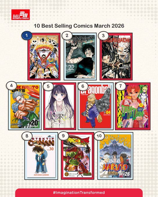 Melalui akun media sosialnya, penerbit Elex Media Komputindo telah memublikasikan judul-judul komik best seller terbitan mereka selama bulan Maret 2026. Inilah komik-komik Best Seller Elex Media Maret 2026:
