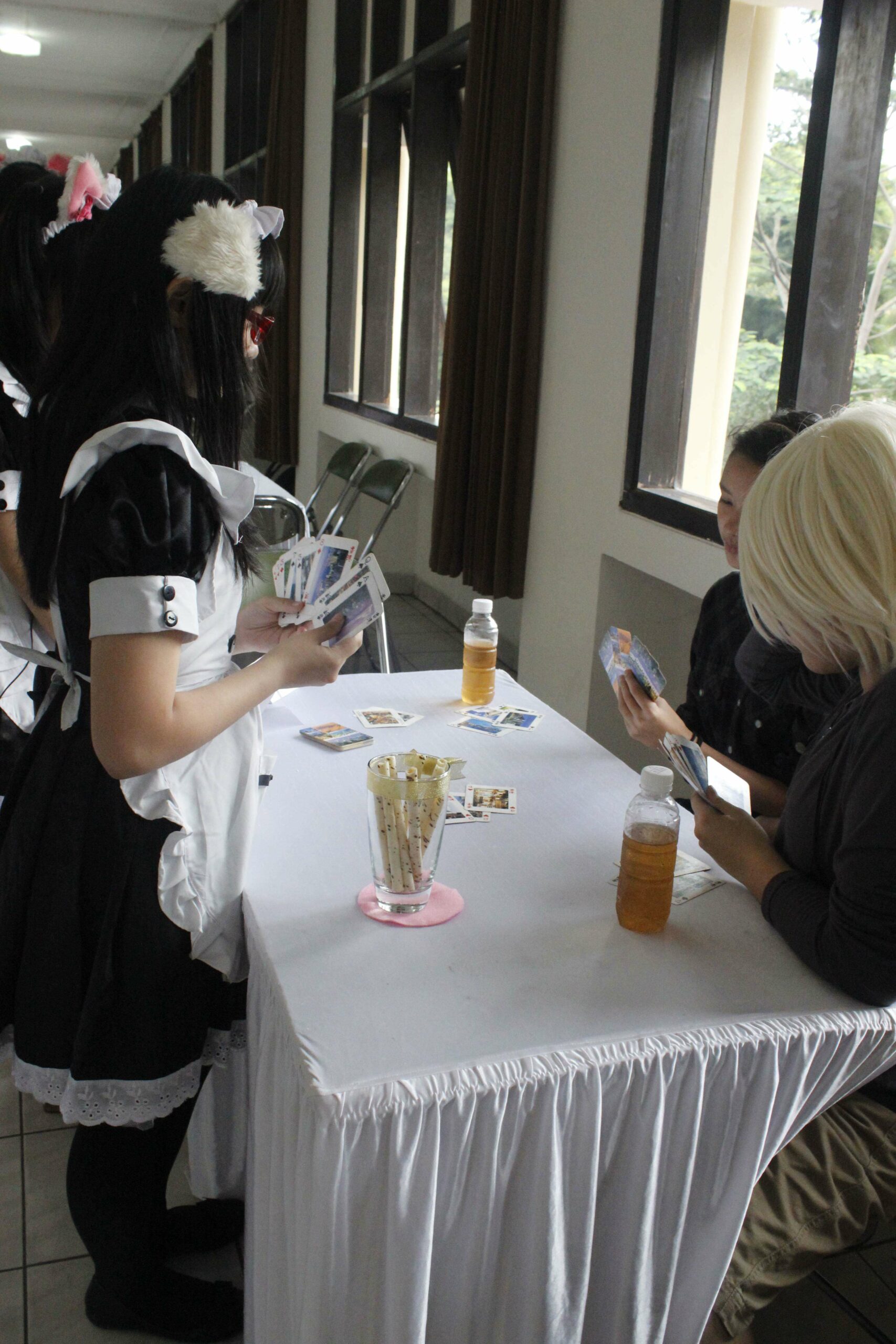 Setelah memesan makanan, para maid akan menemani pengunjung dengan berbagai permainan yang telah disediakan. Uniknya dari permainan-permainan tersebut adalah terdapat ganjaran bagi yang kalah, atau dikenal sebagai Batsu Game. Ganjaran yang disediakan juga sangat menarik, pengunjung harus memilih acak dari angka-angka yang disediakan maid dan angka tersebut akan menentukan ganjaran apa yang akan diterima oleh pengunjung beberapa diantaranya adalah menari bersama maid, bernyanyi, dan sebagainya.