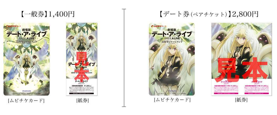 Selain tiket reguler, rencananya akan dijual juga tiket dengan jenis “Date” seharga 2.800 Yen (sekitar Rp340.000). Tiket jenis “Date” ini berlaku untuk 2 orang penonton dan disertai bonus berupa booklet spesial berisikan cerita singkat yang ditulis oleh Koushi Tachibana sang penulis dari novel ringan Date A Live. Tiket Date A Live: Mayuri Judgement ini akan mulai dijual pada 10 April 2015 mendatang.
