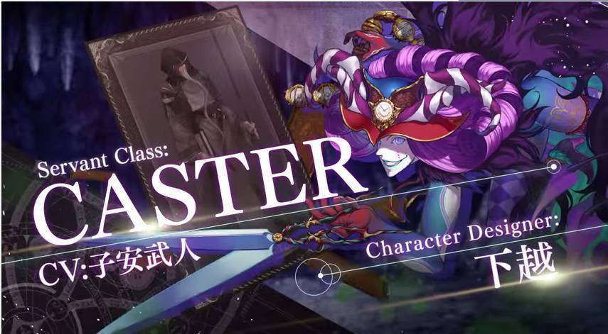 Sama seperti pengumuman karakter servant baru yang lain, karakter Caster ini diperkenalkan melalui sebuah video promo singkat. Pada video tersebut, ditampilkan sosok Caster ini adalah seorang yang berpenampilan seperti badut dengan bersenjatakan gunting di tangannya. Karakter Caster ini di-ilustrasikan oleh Kaetsu dari Type-Moon.