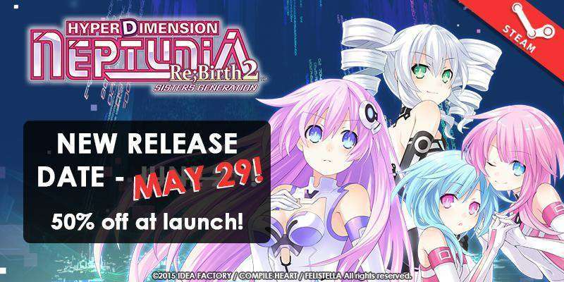 Pengumuman perubahan tanggal rilis tersebut diumumkan pada laman resmi serta akun facebook resmi dari pihak Idea Factory. Jika sebelumnya pihak Idea Factory menyatakan bahwa game Hyperdimension Neptunia Re;Birth 2: Sisters Generation yang harusnya rilis pada tanggal 19 Mei mendatang akan dirilis pada tanggal 2 Juni mendatang, namun kali ini disebutkan bahwa tanggal rilis game tersebut akan dimajukan menjadi tanggal 29 Mei mendatang.