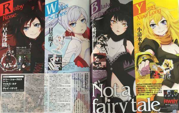 Dalam majalah Newtype terbaru, diumumkan bahwa empat pengisi suara alias seiyuu yang akan berpartisipasi dalam dub bahasa Jepang anime RWBY. Majalah tersebut juga menyertakan lampiran ilustrasi khusus dari Asako Nishida.