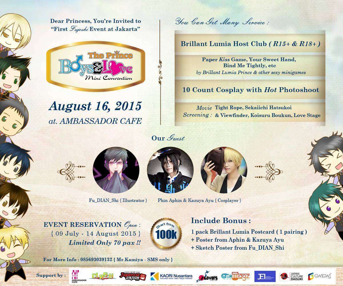 Talkshow seputar Boys Relationship dan Doujin IllustrationEvent ini terbatas untuk umum dan hanya untuk wanita berumur 15+ dengan reservasi terbatas hanya 70 pax saja. Harga reservasi dengan rincian berikut: Premium Seat : Rp. 150.000, Reguler Seat : Rp. 125.000, dan Window Seat : Rp. 100.000.