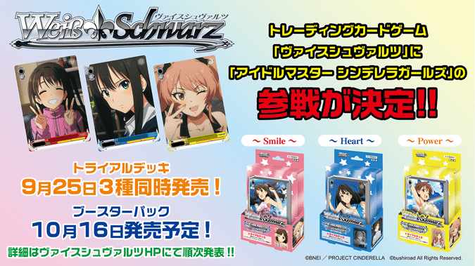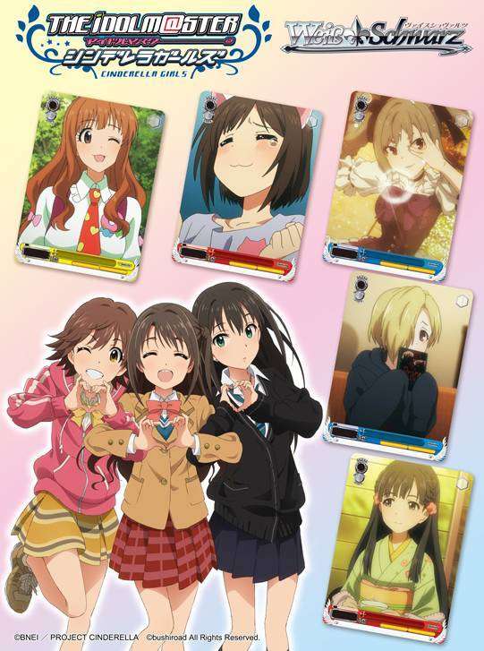 Pihak Bushiroad yang juga dikenal dengan permainan kartu Cardfight!! Vanguard serta Future Card Buddyfight ini akan merilis jajaran kartu Weiss Schwarz dari seri Idolm@ster Cinderella Girls dalam bentuk Trial Deck (1 set kartu siap main) dan sebuah Booster Pack (ekspansi). Nantinya para penggemar seri Idolm@ster Cinderella Girls akan dapat memainkan para idola favoritnya dalam permainan kartu ini.