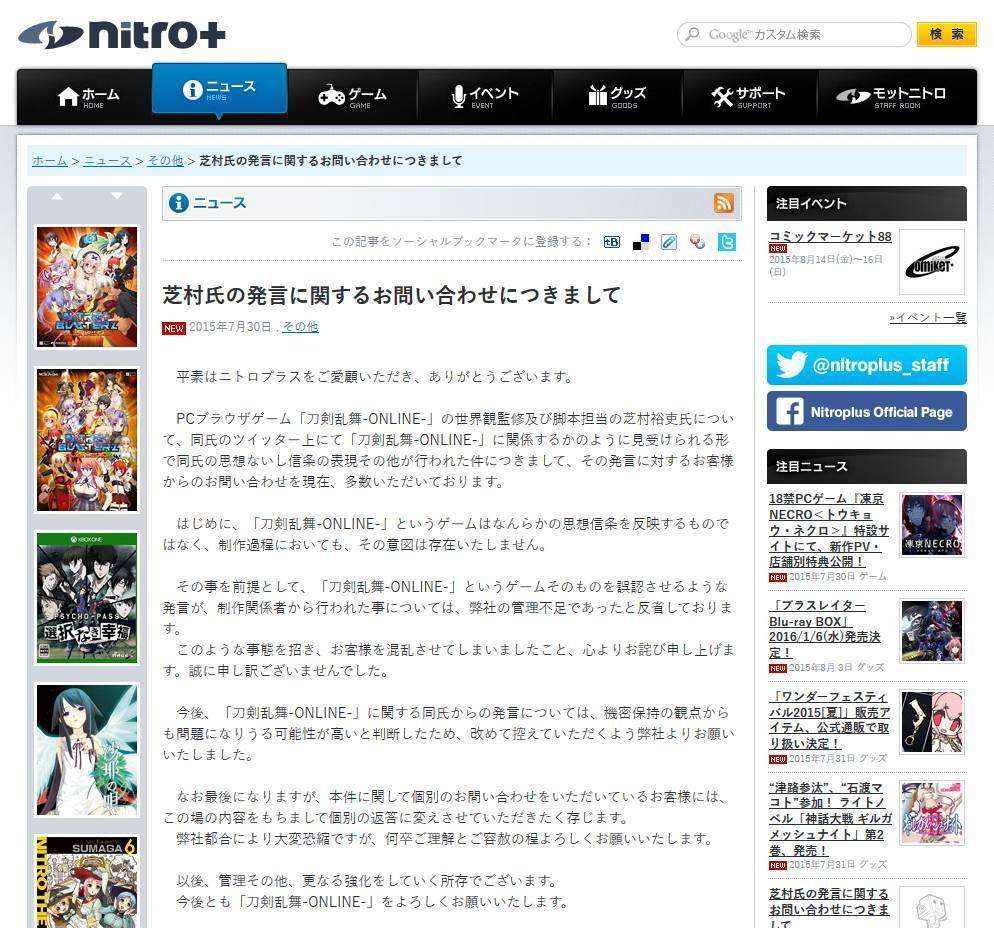 Begitu signifikannya masalah ini sehingga pada 30 Juli lalu, Nitroplus sampai harus mengeluarkan siaran pers untuk menenangkan gejolak di jagad maya.