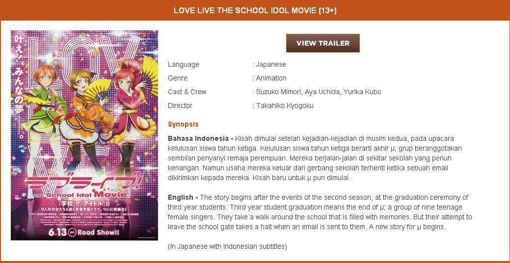 Setelah sebelumnya dikabarkan bahwa film layar lebar dari serial Love Live! School Idol Project akan hadir di Indonesia, kini jaringan bioskop Cinemaxx telah mengkonfirmasi akan turut memutar film tersebut.