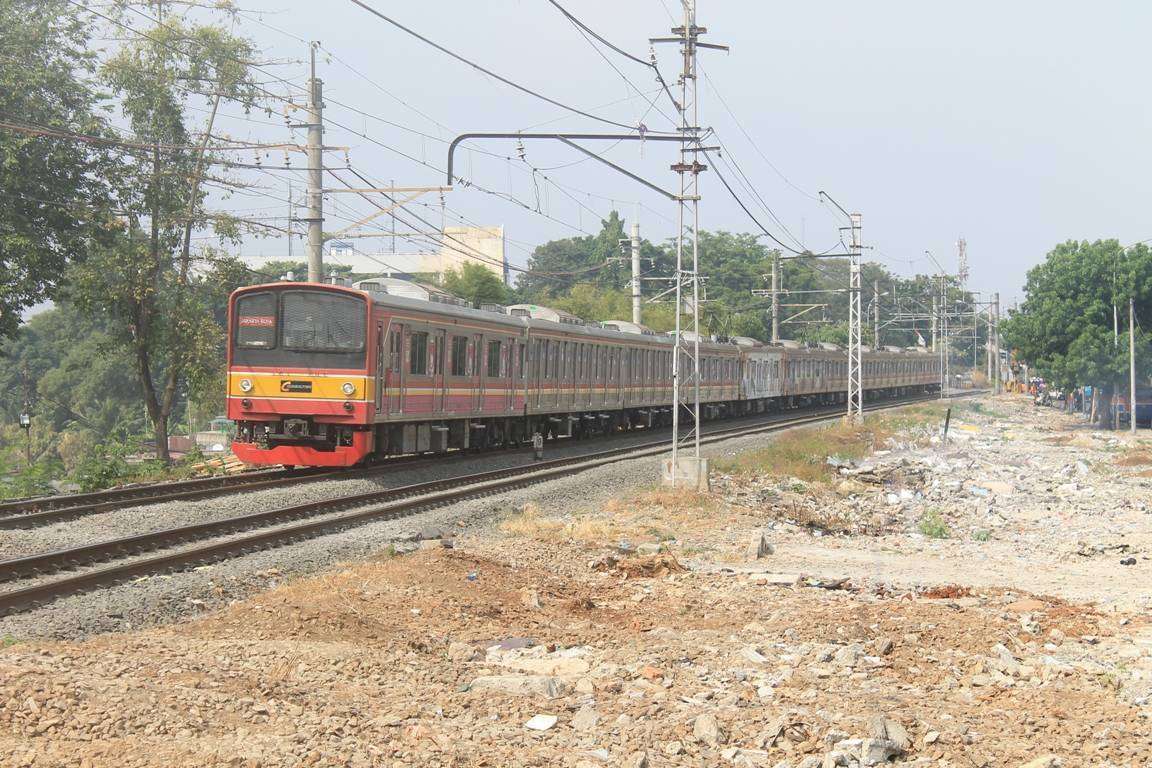 KRL seri 205 formasi 12 kereta melintasi area pekerjaan penambahan peron sisi selatan di stasiun Bojonggede