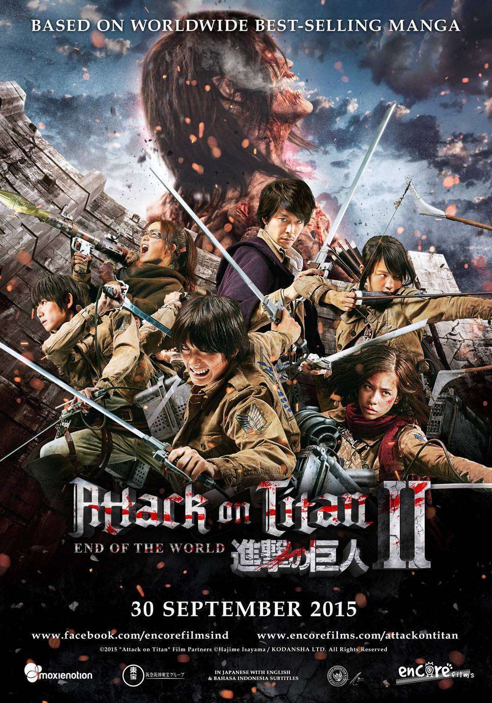 Terror raksasa yang mengancam kehidupan manusia serta memangsa manusia berlanjut. Setelah film pertamanya, kali ini para Titan kembali dalam film live-action Attack on Titan Part 2: End of The World yang akan segera hadir di tanah air. Film live-action dari seri yang sempat populer di tahun 2013 ini disutradarai oleh Shinji Higuchi, yang dikenal dengan karyanya, The Sinking of Japan, serta juga cukup dikenal sebagai salah satu founder studio animasi Gainax. Mengusung konsep sebagai film live action dengan efek khusus, Onoue Katsuro terlibat dalam film ini untuk menangani efek khusus dalam film ini.