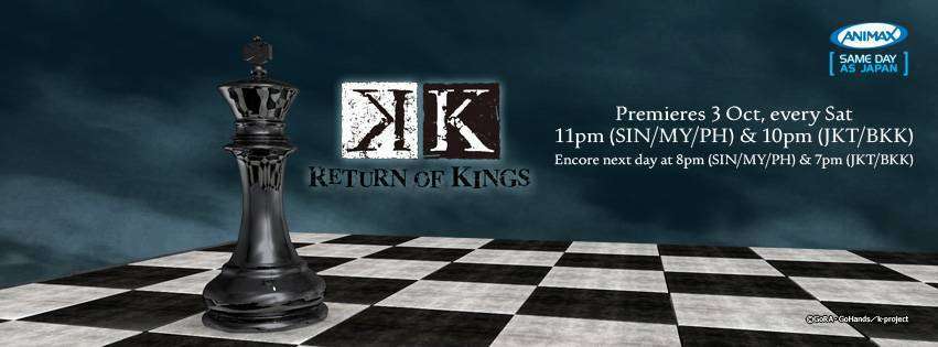 Pada bulan Oktober nanti, penayangan seri anime untuk musim gugur tahun ini akan dimulai. Salah satu dari seri anime yang akan tayang di bulan depan adalah K: Return of The Kings. Disebutkan bahwa seri anime ini akan tayang di Indonesia melalui kanal televisi berbayar Animax Asia.