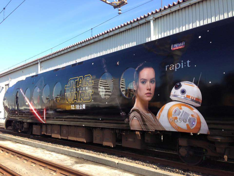 Perusahaan kereta Nankai yang mengoperasikan layanan kereta api (KA) bandara di jalur Bandara Internasional Kansai hingga stasiun Namba di Kota Osaka ini “merias” salah satu rangkaian keretanya yang dikenal sebagai “Tetsujin 28” menjadi sebuah kereta dengan nuansa Star Wars. Hal ini merupakan aksi promosi yang dilakukan oleh pihak film Star Wars yang akan meluncurkan film terbarunya dengan judul Force Awakens.
