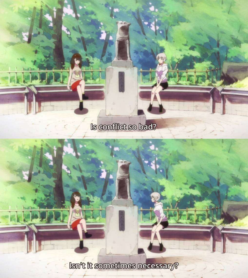 Pandangan berbeda diberikan oleh karakter utama lainnya, Hajime Ichinose. Di episode empat ia mempertanyakan pandangan Gel dan Tsubasa yang menganggap konflik adalah hal yang buruk. Tentu saja itu tidak berarti Hajime berpandangan bahwa adalah hal yang baik bagi manusia untuk saling bermusuhan dan menyakiti seperti yang dituduhkan Tsubasa. Posisi Hajime dapat dipahami sebagai suatu sikap menerima bahwa konflik adalah kondisi niscaya dari kehidupan bermasyarakat, bahwa perbedaan itu pasti selalu ada karena manusia pada hakikatnya adalah makhluk yang berbeda-beda. Hajime menawarkan pandangan mengenai konflik yang tidak terjebak pada “perilaku teknologis”. Daripada menyakiti diri dan orang lain demi menghilangkan perbedaan dan memaksakan persamaan biarpun secara halus, masyarakat perlu menerima keberadaan konflik dan belajar untuk hidup dengan konflik. Inilah keselamatan yang dapat ditemukan dalam relasi antara manusia dengan konflik.