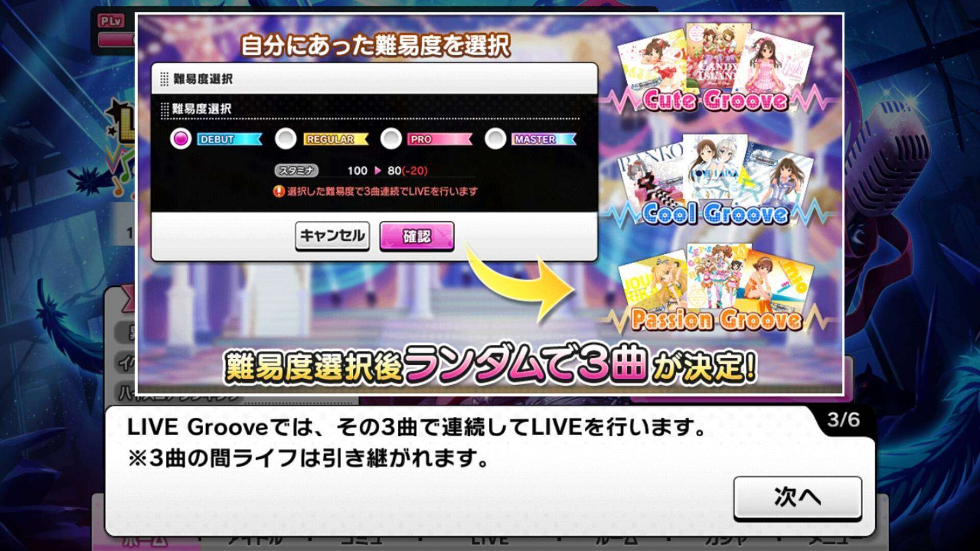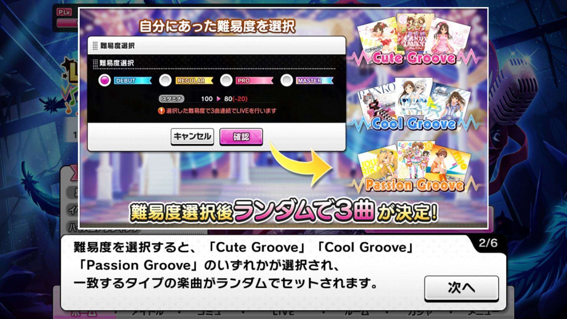 Seperti biasa, ada 3 macam Groove yang bisa dimainkan yaitu Cute, Cool, & Passion. Setelah memilih tingkat kesulitan permainan, pemain akan diberikan tipe groove dan lagu secara acak.